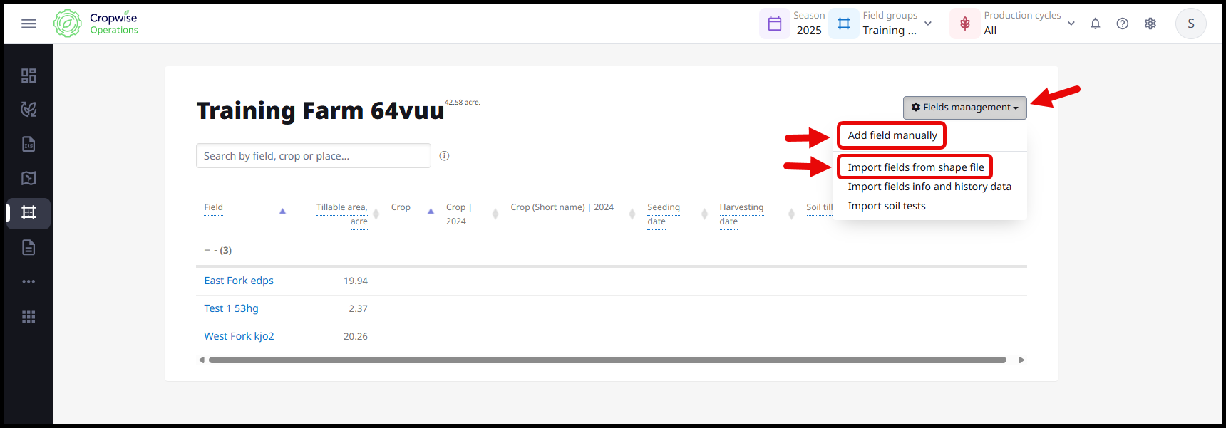 Next, select on Fields Management to open the drop down list. Then choose the preferred method of adding fields. Add fields manually or Import fields from shape file.