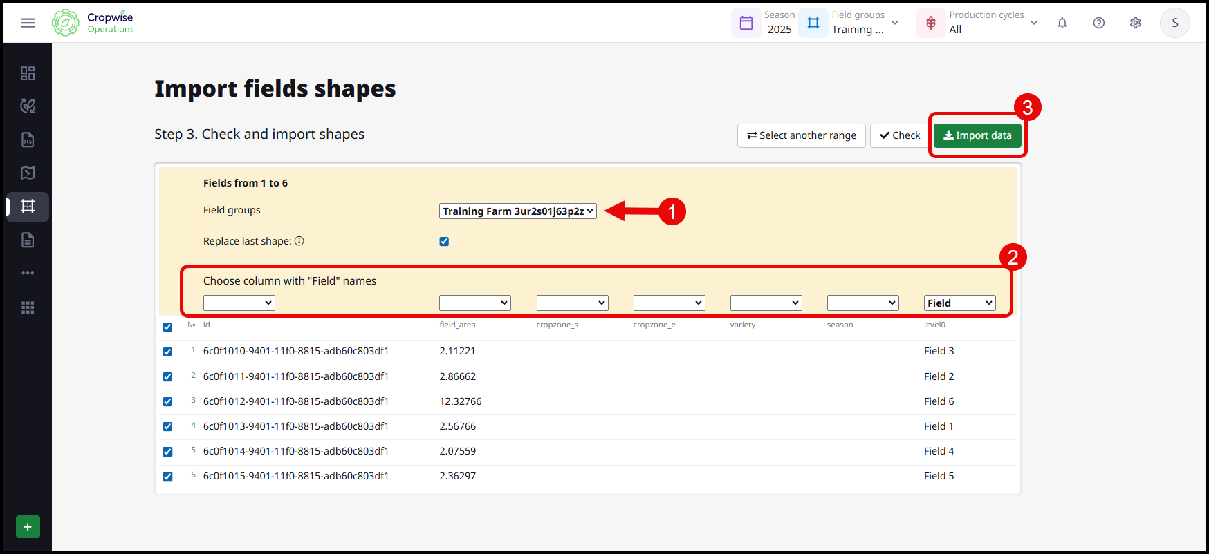 Select a Field Group from the drop down in the middle of the screen, then locate the column in the attribute table below and select the Field ID within the drop down which corresponds to the desired field names. Once selected, choose Import data.