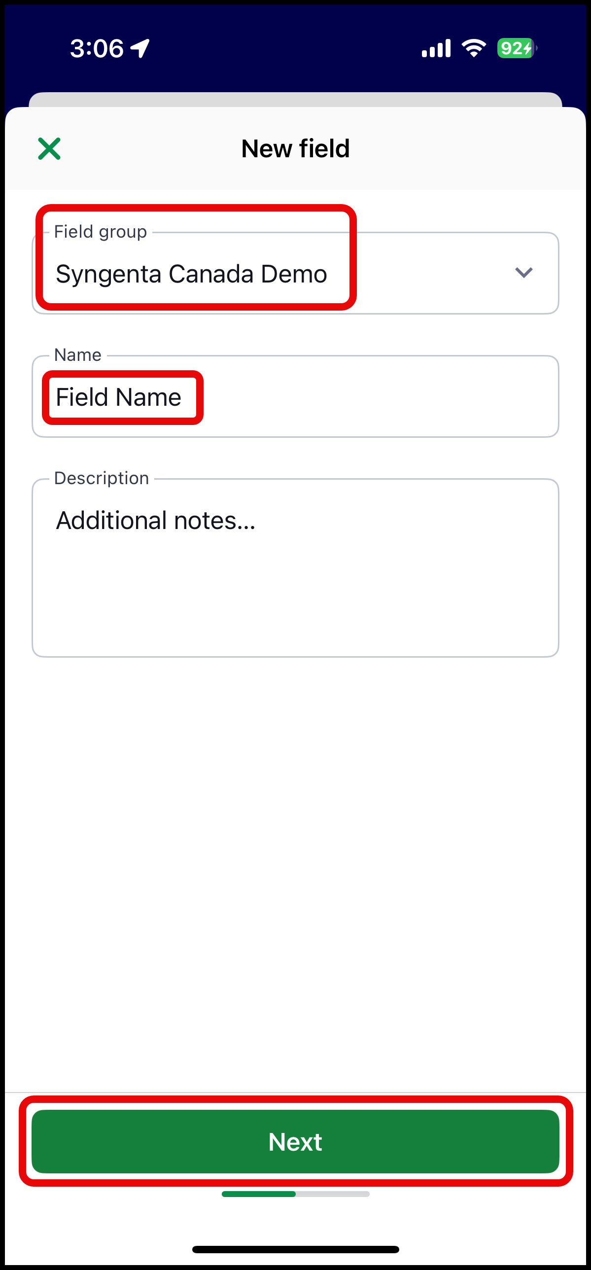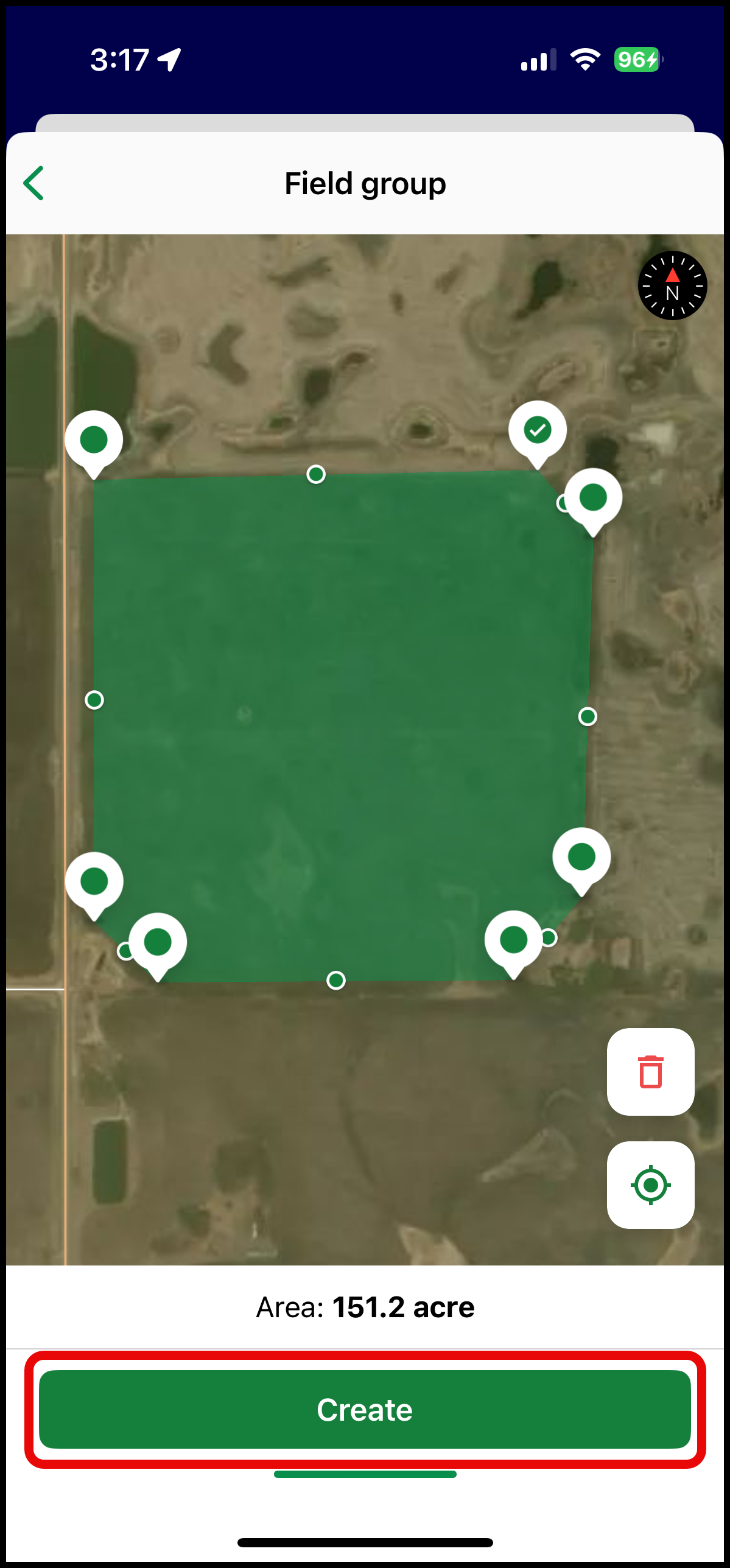 Next, you will fill in the Field group and add the Field name. Any additional notes can be added to the description. Select Next to continue. Navigate the map the field you would like to draw and zoom in to place an outline around the field. More detailed boundaries can be created on the web, see Change & Edit Boundaries. Select Create to complete.
