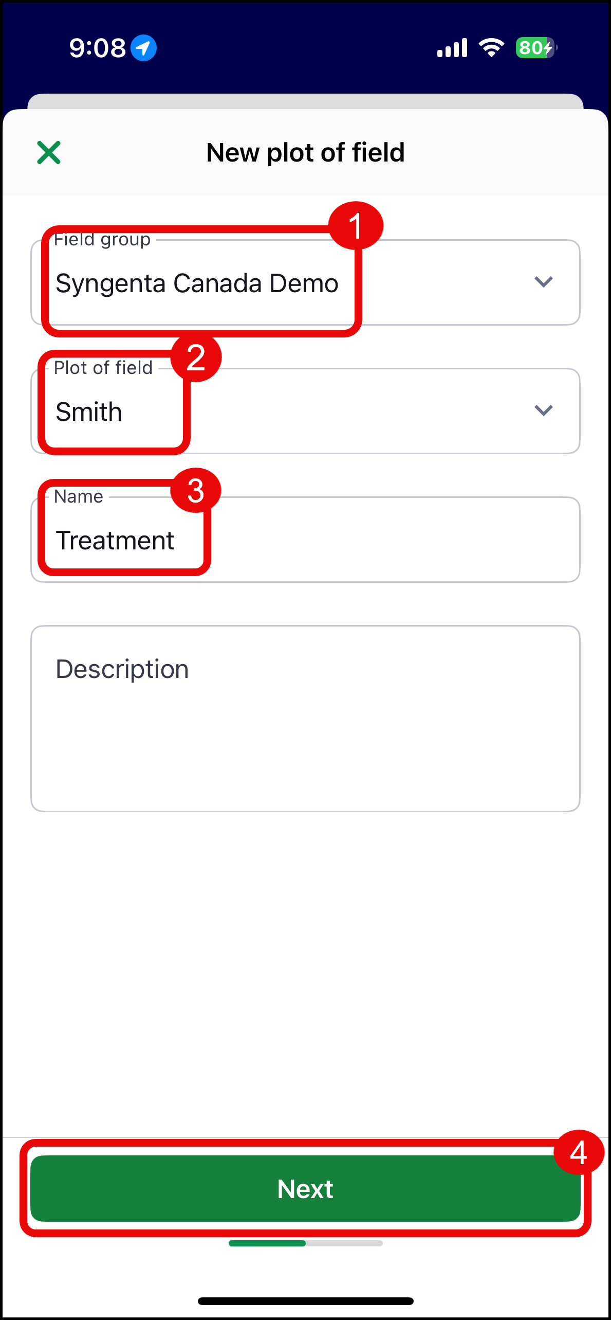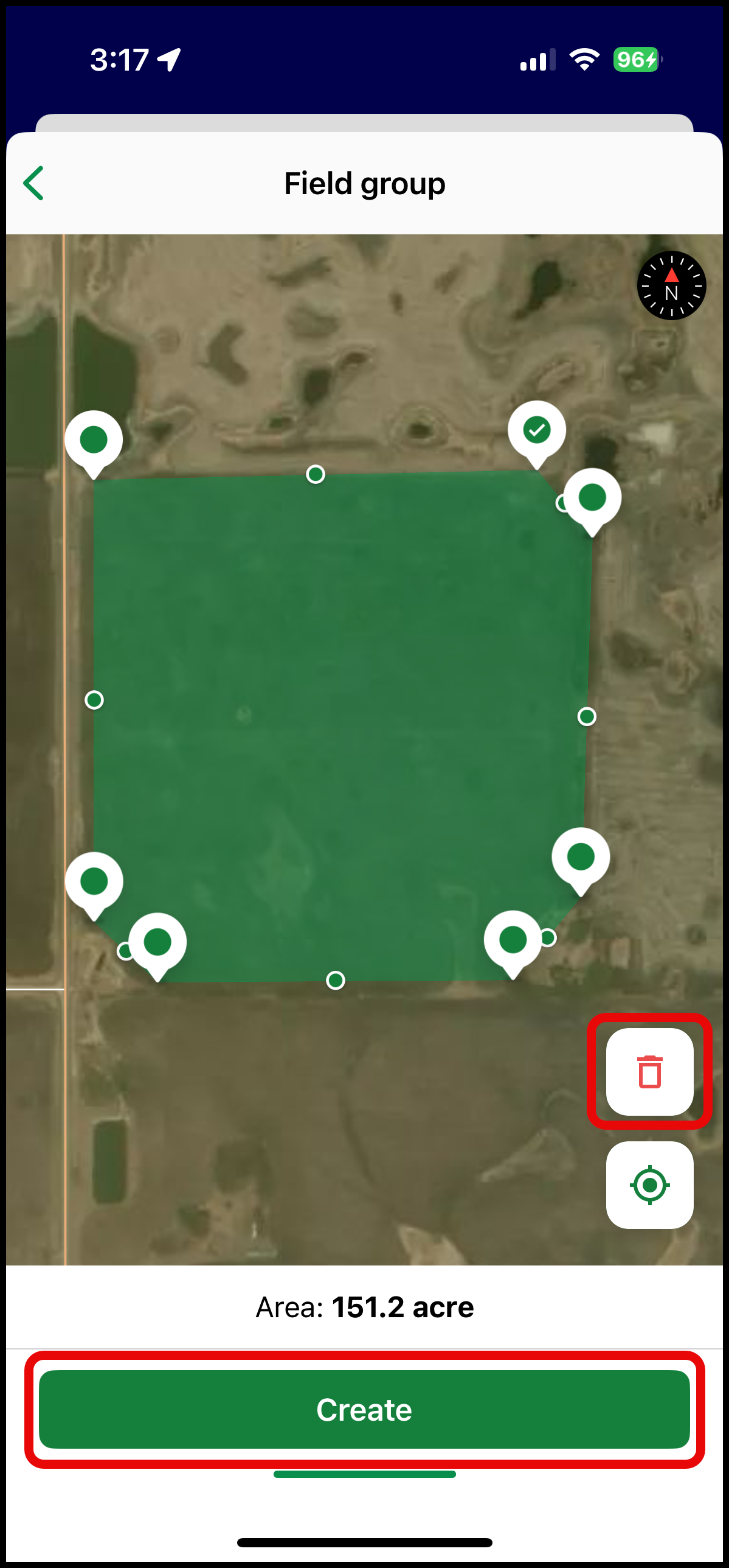 Next you will select the field group (1) that the field you are adding the plot to belongs to. Under Plot of field (2) select the field that this plot belongs in. Then Name (3) your plot, and select Next (4) to draw the boundary. Before drawing the boundary, delete the shape of the main field by selecting the trash can. Then, tap the screen to draw the boundary of the plot. Hit Create to complete.