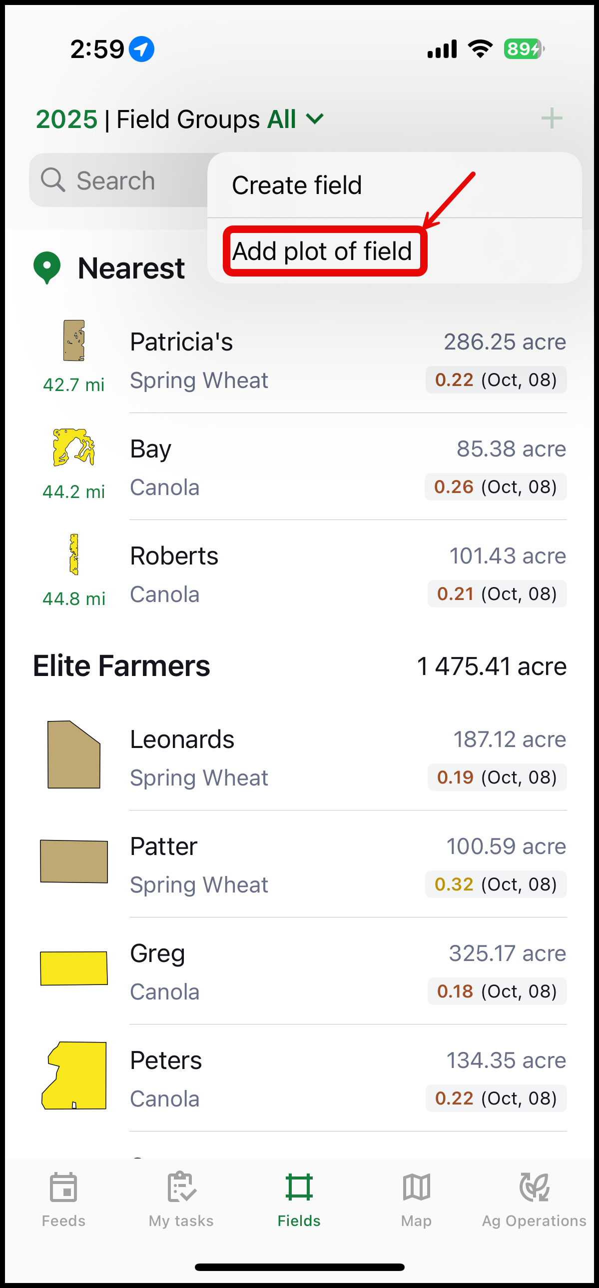 To create a new plot boundary on your mobile device please select Fields along the bottom menu, then select "+". Select Add plot of field to draw a new plot for your farm.