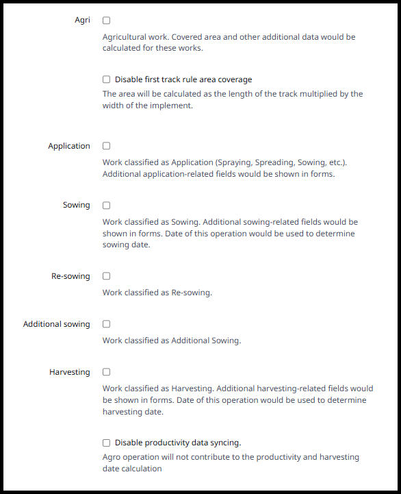 NOTE: Disable first track rule area coverage if you want this work subtype to be able to save agro operations that are over the tillable acres for that field.