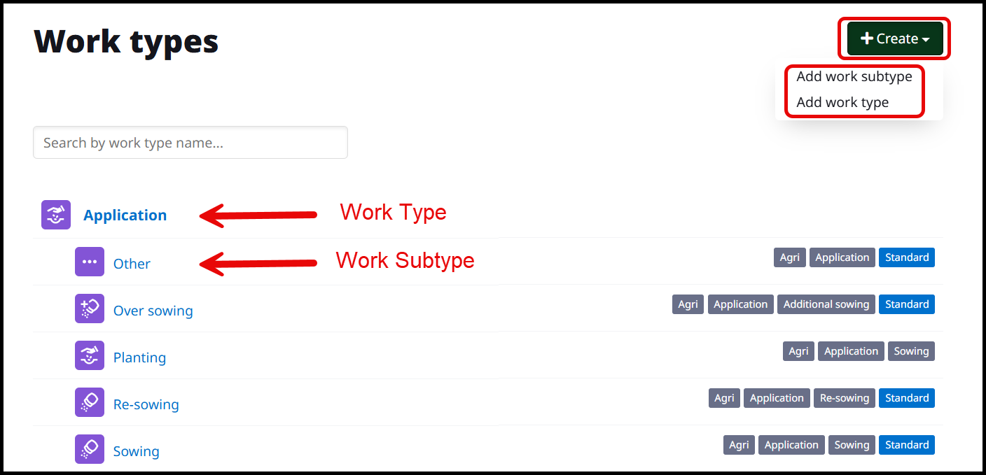 Cropwise Operations allows users to customize the Work Types and Work Subtypes catalog. Work types are a grouping of work subtypes. Here is how to create new work types and work subtypes.