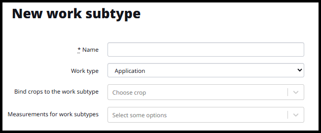 Follow the same steps to create a new work subtype. Name the new work subtype. Choose the Work type group that this subtype belongs to. Bind crops to the new work subtype if you would like that work subtype to only be available to certain crops. Measurements for work subtypes can be added if there is specific data that needs to be captured with that work subtype. A common example of a measurement that is added is "Tank Mix Order" as a measurement for a spraying agro operation. See Adding measurements for work subtypes for more.