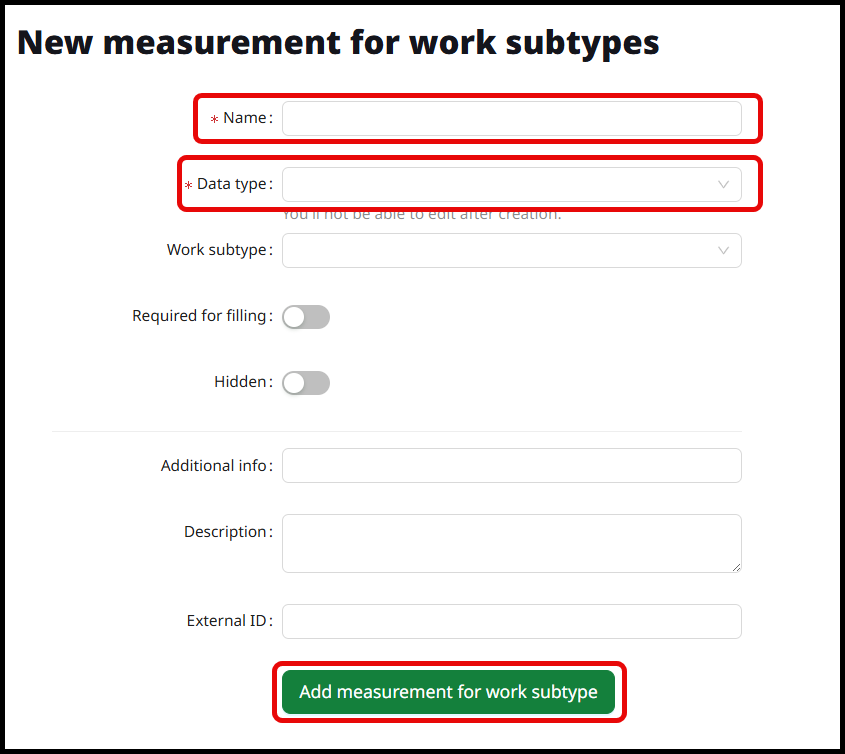 Add the work subtype(s) you would like this measurement to be added to. If you would like the measurement to be required to save the agro operation being entered, select Require for filling. The measurement can be hidden from the work subtype if needed. Add Measurement for work subtype to complete.