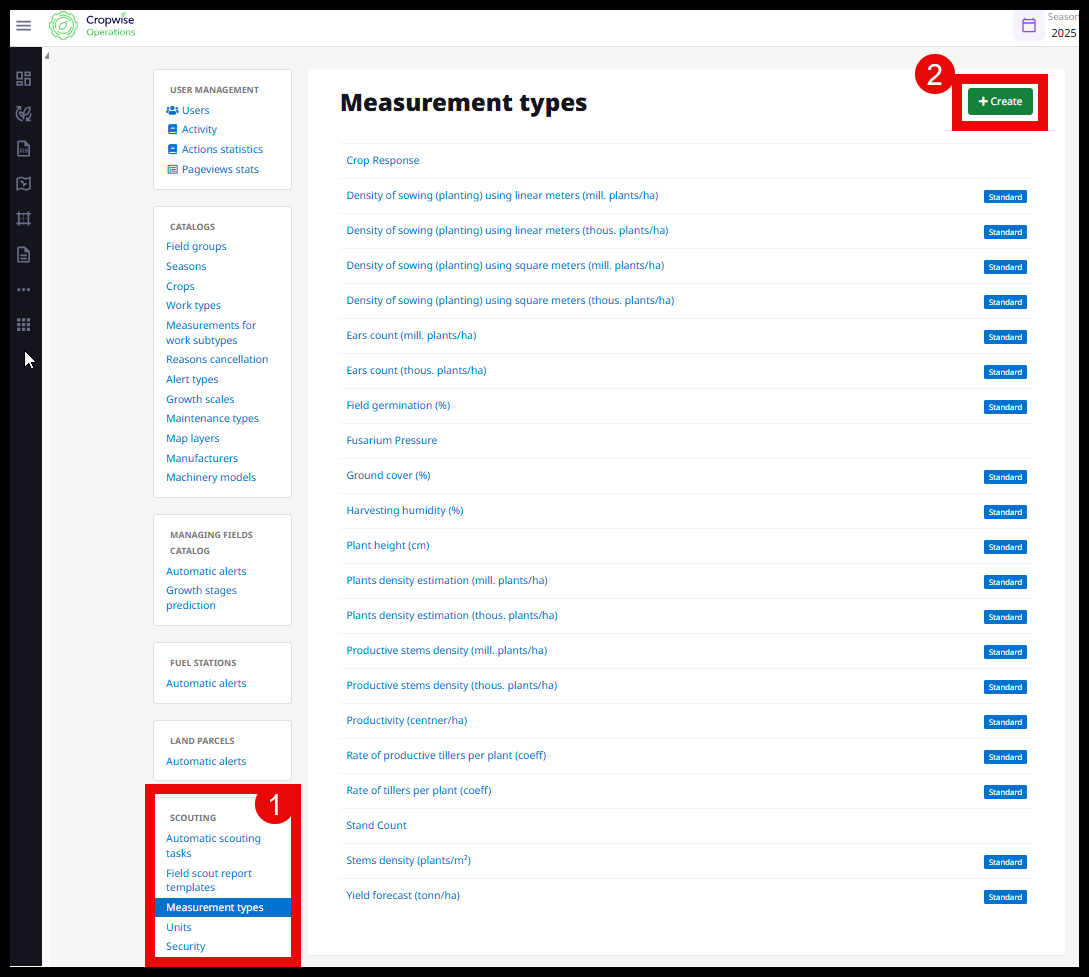 In addition to standard measurements, such as the density of planting, ears count, productivity, etc. the Platform enables its users to create their own measurement types and units and add any number of their parameters to the system. Then the users can use these measurements in Scouting Reports.