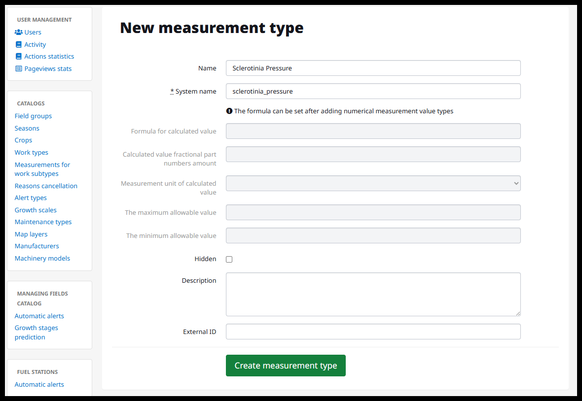 Measurement types and units can be added to the system by the users with the “Administrator” and “Manager” statuses.