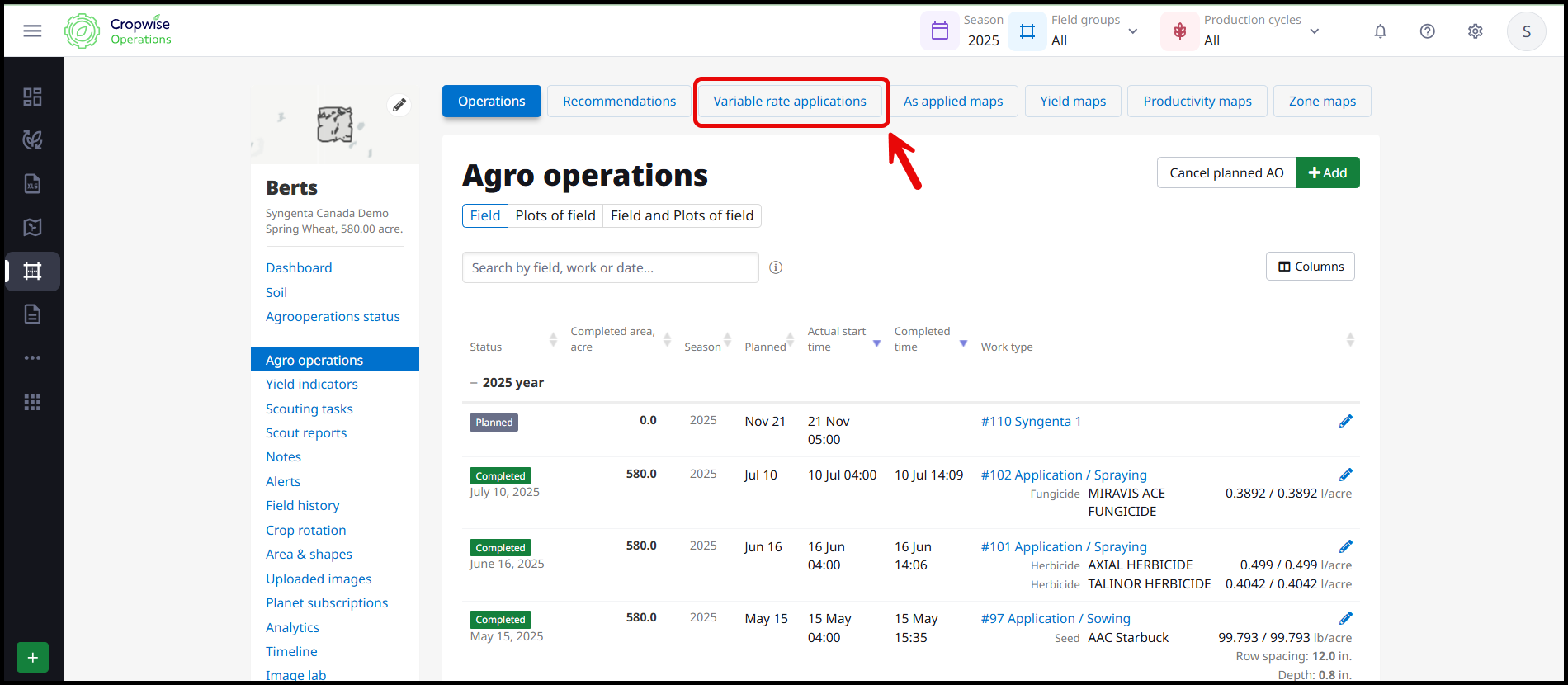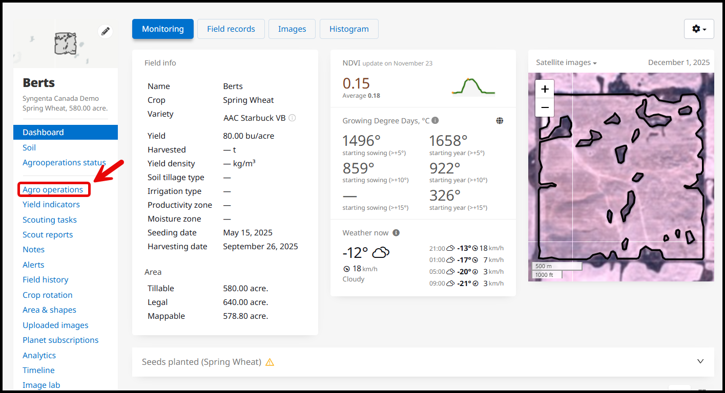 To create a variable rate application map, start on the field's dashboard and select agro operations on the left. Variable rate application maps can be created field by field, or in batches.