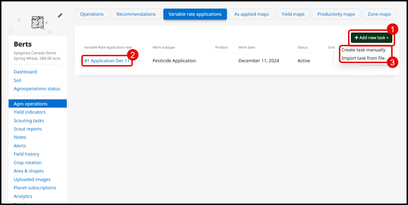 To create a new VRA task select Add new task (1). To edit or download an existing task, open the task by selecting the task (2). You can create task manually (3) from maps in CWO, or you can import a task from file (3) from a third party.