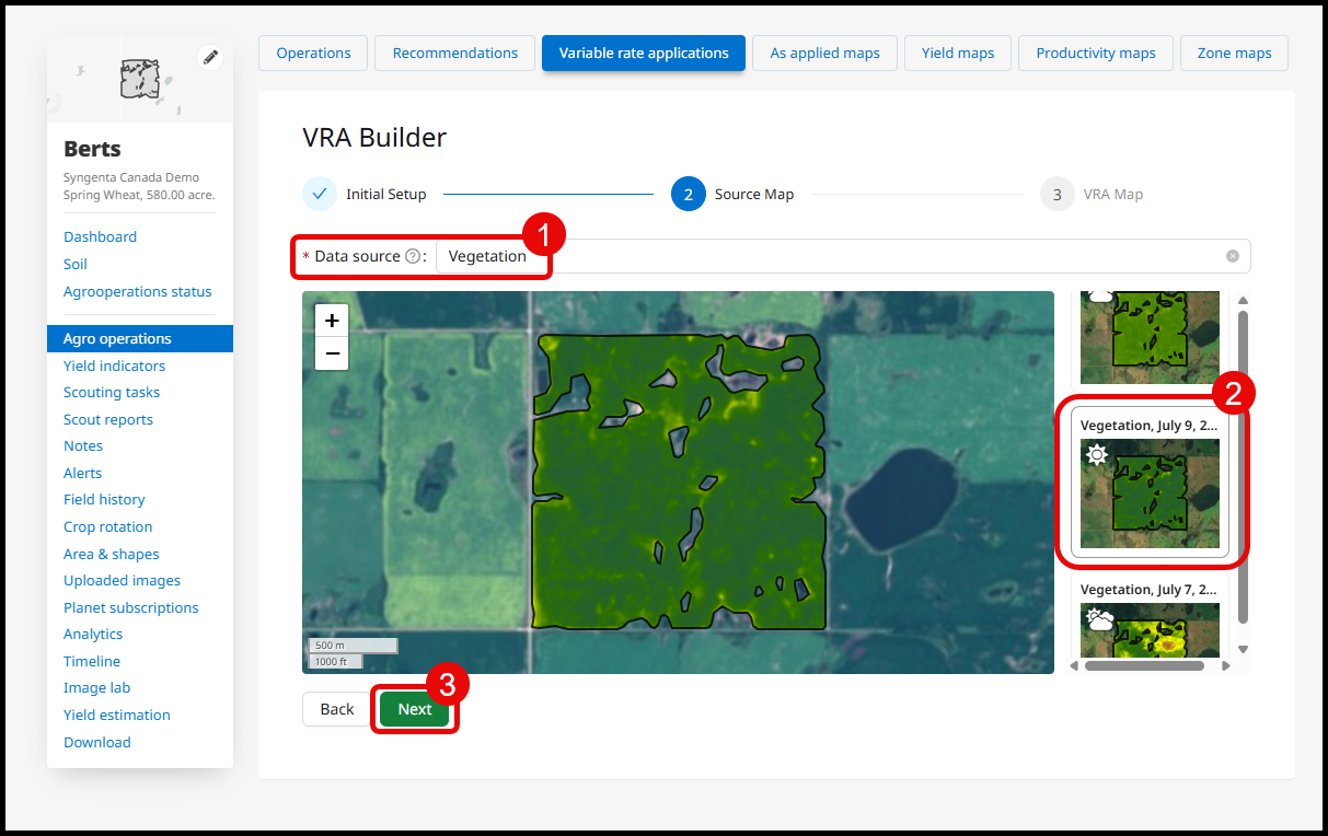 First, choose your data source. Since we are creating an on/off map, we will use the most recent vegetation image to create our zone map. Select Vegetation from the data source options (1). Scroll through the images to select the most recent cloud-free image (2). Select Next (3) to continue.