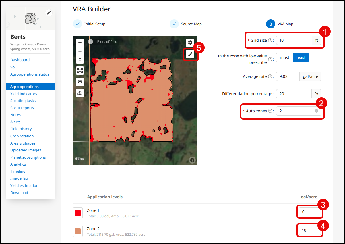 Enter your grid size (1); this will be the width of your sprayer or the width of sections of nozzles on your sprayer. This will represent the size of areas that can be varied. Auto zones (2) will be set to 2 for this example. Enter the rates of each zone on your map (3 & 4). Click the pencil (5) to manually edit any zones on the map. Select the color you would like to add, and zoom to select the zone you would like to change. Scroll down to hit Save to complete.