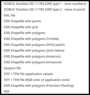 These are the file types available for download. Please consult your equipment manufacturer for the correct file type required by your sprayer.