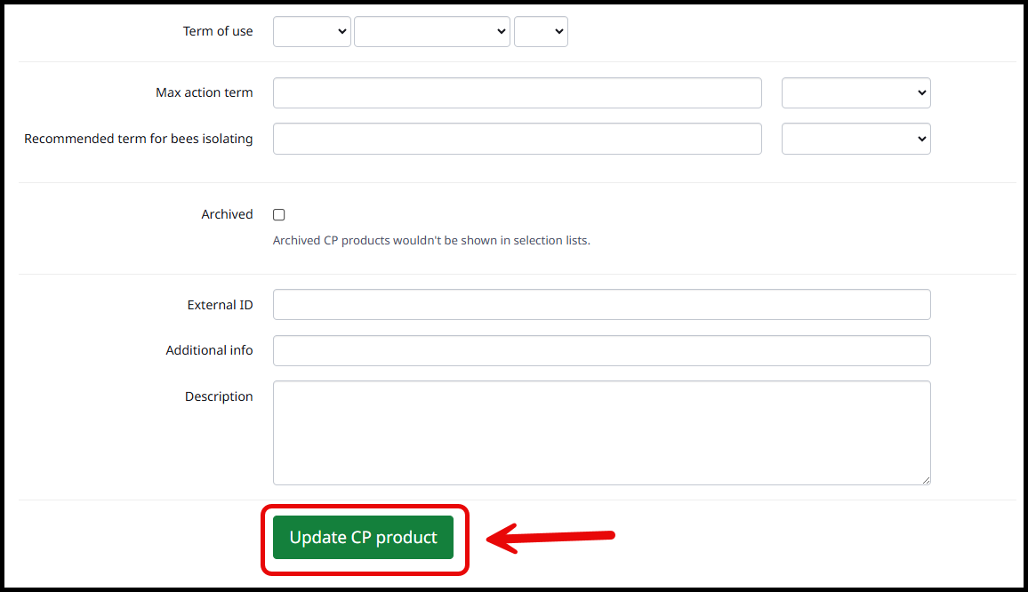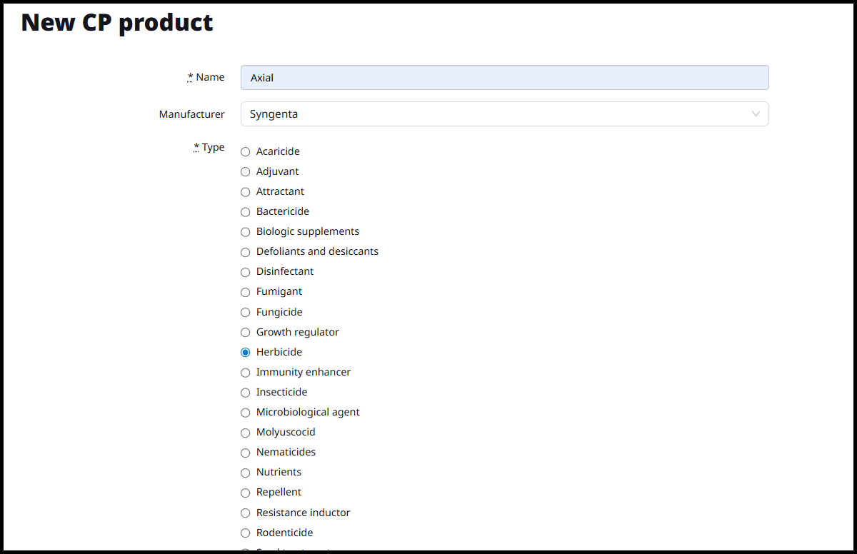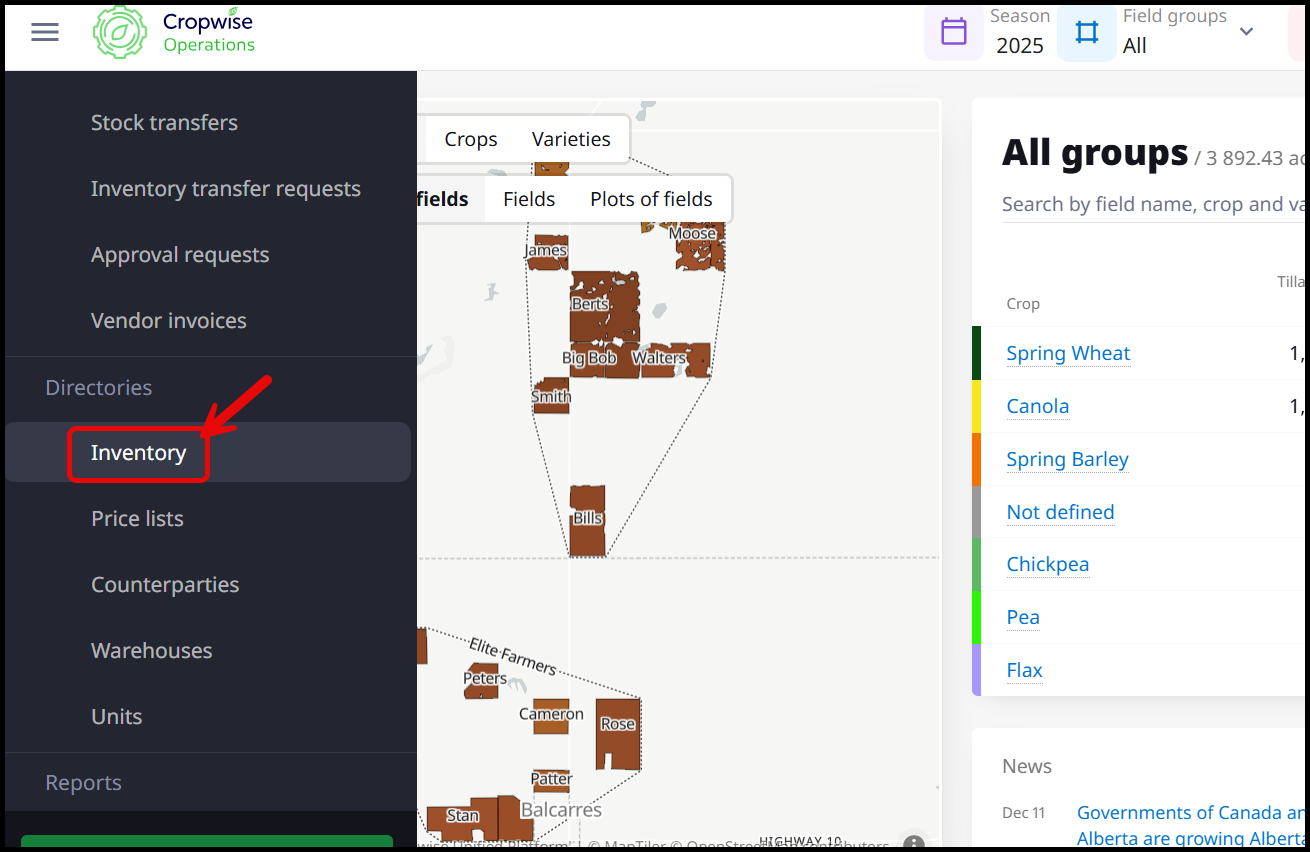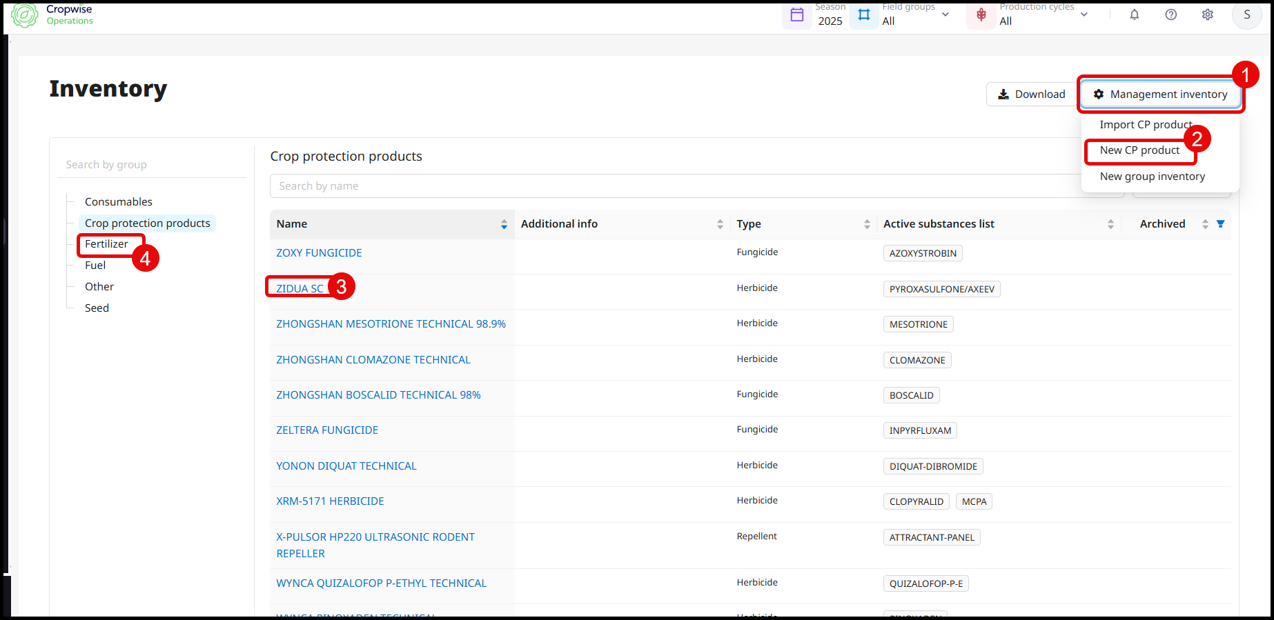 Your inventory list will include any products that you have added to your CP products, fertilizers or seeds lists. To create a new product select inventory management (1), then new CP product (2). To update an existing product in inventory you can open the product by clicking on the product name (3). To update products that belong in other inventory groups, navigate to that category by selecting the category name on the left (4).